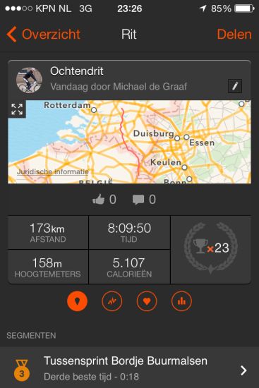 De verbinding is hier niet zo goed, waardoor ik met de iPhone app Strava nog niet precies kan zien hoeveel ik gefietst heb. Volgens de kaart zou dit 112 km moeten zijn.