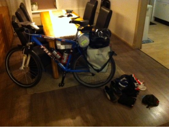 De fiets is bepakt en bezakt met tent, slaapzak, slaapmat etc. Ik hoop om een uur of half acht te kunnen vertrekkken met als eerste eindbestemming Maastricht.